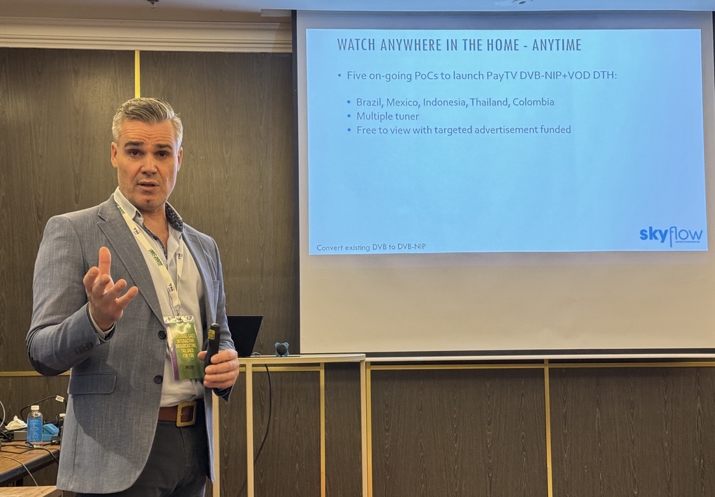 Richard Smith (above) of EKT focused on DVB Native IP. He explained how the new specification makes it possible to provide unicast streams over a satellite multicast network, thus making that content available over Wi-Fi in the home or in public venues. With this ability to reach all connected screens, he said, DVB-NIP represents the biggest opportunity in satellite since its inception. (Download slides)