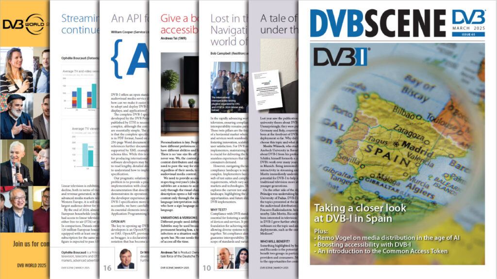 The March 2025 issue of DVB Scene magazine highlights the new DVB-I pilot taking shape in Spain. The cover story, by 3Cat’s Jordi Mata, is just one of several articles focused on DVB’s solution for internet-centric service discovery: there’s also a look at a pair of university theses on the topic, deployments for a PoC in Ireland and on a pan-European satellite platform, synergies with 5G broadcast, and the benefits of taking an API-based approach to DVB-I development. DVB’s new accessibility guidelines – another DVB-I related story – are also introduced.